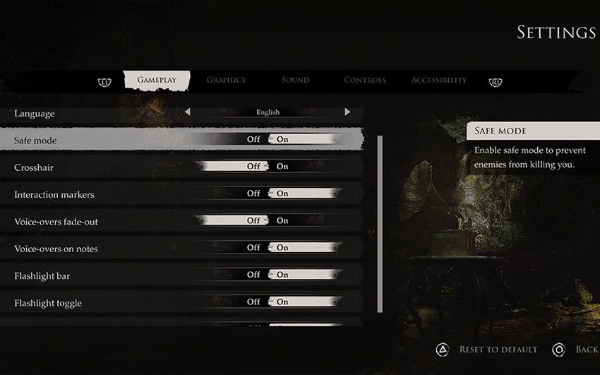 Das Spiel verfügt auch über ein ziemlich gutes System von Spieleinstellungen. Sie können Türen öffnen und schließen, indem Sie einfach eine Taste drücken, anstatt sie gedrückt zu halten. Sie können das Fadenkreuz einschalten, um die Navigation im Raum zu erleichtern, oder das Verwackeln der Kamera ausschalten, wenn Sie ein statischeres Bild benötigen. Und noch etwas Interessantes: Wenn Sie merken, dass Sie mit dem Feind nicht fertig werden, können Sie den Modus einschalten, in dem Sie nicht getötet werden können. Das ist besonders für Leute geeignet, für die dies eines der ersten Spiele überhaupt ist, damit sie sich nicht über das ständige Nachladen zum Checkpoint ärgern, sondern in Ruhe weitermachen.
