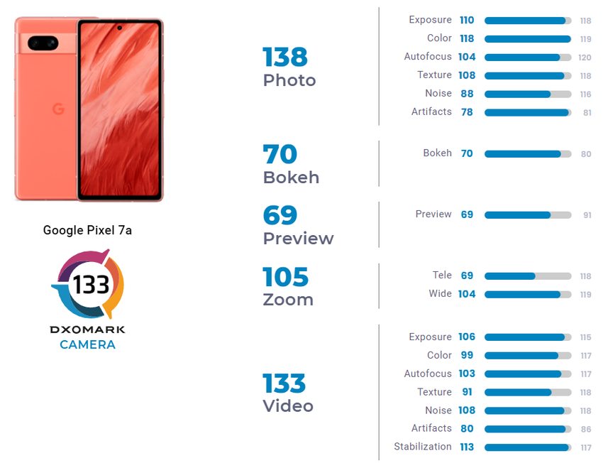 Die Kamera des Pixel 7a erreichte 133 Punkte. Die Fotofähigkeiten des Smartphones erreichten 138 Punkte. Die Zoom-Leistung wurde mit 105 Punkten bewertet und das Ultra-Weitwinkel-Modul mit 104 Punkten. Für die Videoqualität erhielt die Neuheit 133 Punkte.