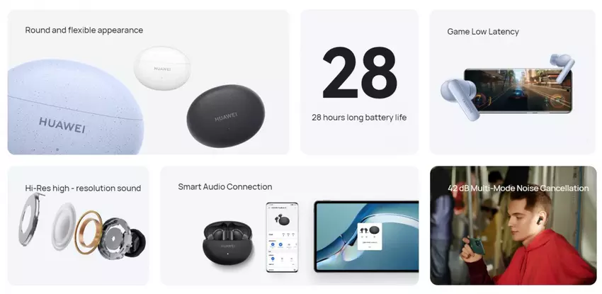 Was die Leistung der FreeBuds 5i angeht, so verfügen sie über ein verbessertes aktives Geräuschunterdrückungssystem (im Vergleich zu den FreeBuds 4i). Es unterdrückt Fremdgeräusche um bis zu 42 dB. Die Ohrstöpsel sind außerdem mit Bluetooth 5.2 und 10-mm-Treibern ausgestattet. Das Gerät unterstützt den LDAC-Codec und ist außerdem Hi-Res Audio Wireless zertifiziert. Die Freebuds 5i können mit mehreren Geräten verbunden werden.