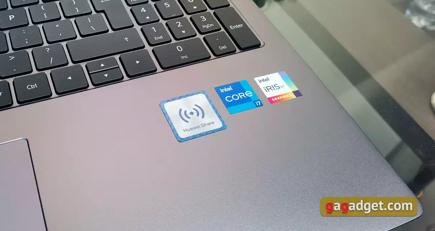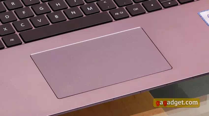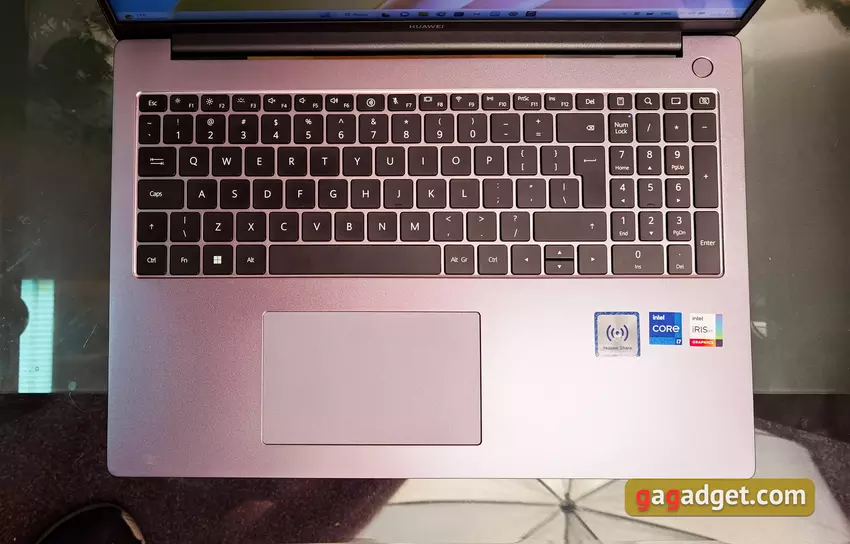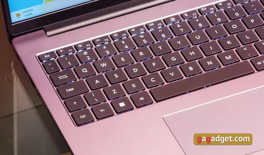 Leider kam das Exemplar bei uns nicht mit einem für unser Land ungewohnten Tastaturlayout an. Mit vertikalem Enter, sehr kurzer linker Umschalttaste und anderen Besonderheiten, an die man sich erst gewöhnen muss. Offizielle Laptops werden aber das gewohnte Layout haben. Von den interessanten Funktionen - es gibt einen zusätzlichen Nummernblock, der für diejenigen nützlich sein kann, die viel mit Tabellen arbeiten, oder gewohnt sind, ihn zur Eingabe von Sonderzeichen zu verwenden. Oberhalb des Blocks befinden sich zusätzliche Tasten zum Ausschalten der Kamera, zum schnellen Starten des Rechners, zum Minimieren des aktiven Fensters und zur Schnellsuche. Die Einschalttaste ist vom Haupttastaturblock getrennt und mit dem Fingerabdruckscanner kombiniert. Sie wird ausgelöst, wenn das Notebook eingeschaltet wird.