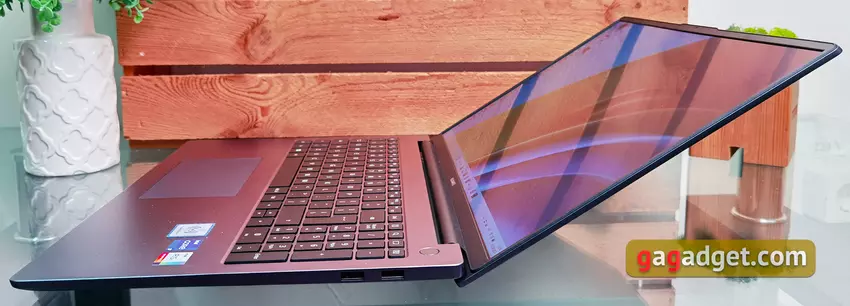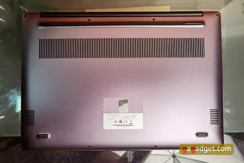 An der Rückseite befindet sich ein breites Scharnier, das den größten Teil der Breite des Notebooks einnimmt. An der Vorderseite befindet sich an der Stelle der Webcam eine Kunststofflasche, mit der sich das Notebook leicht öffnen lässt. Und an der Vorderseite des Hauptgeräts befindet sich eine Anordnung von 4 Mikrofonen. Huawei behauptet, dass diese eine 360°-Tonaufnahme in einer Entfernung von bis zu 5 Metern ermöglichen.
