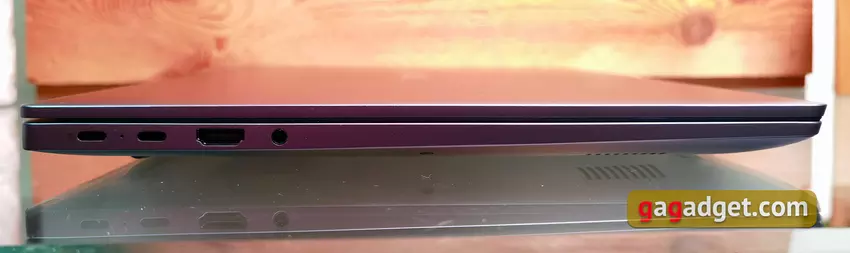 Das Notebook verfügt über eine gute Anzahl von Anschlüssen. Auf der linken Seite befindet sich ein USB-Typ-C-Anschluss mit Unterstützung für Datenübertragung, Laden und DisplayPort, ein weiterer USB-Typ-C-Anschluss ohne DisplayPort, HDMI und ein kombinierter 3,5-mm-Kopfhöreranschluss.