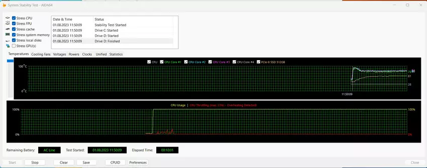 Das Kühlsystem funktioniert im Großen und Ganzen wie bei den meisten modernen Notebooks: Zu Beginn des AIDA64-Tests erwärmt sich das System auf ca. 95°, es gibt ein gewisses Ruckeln. Nachdem sich das Kühlsystem an die Last angepasst hat, bleibt die Temperatur der Komponenten bei 75-80° und es gibt keinen weiteren Leistungsabfall. Unter Last ist ein Rauschen zu hören, das aber nicht als laut oder störend bezeichnet werden kann. Das Gehäuse erwärmt sich so gut wie gar nicht.
