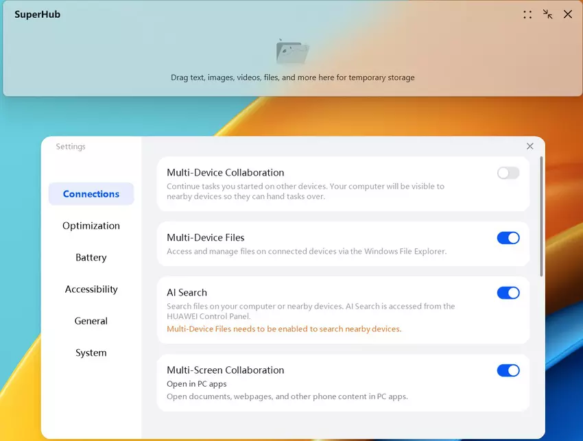 Das Notebook unterstützt auch Quick Connect für Smartphones und Tablets zur Bildschirmspiegelung oder zum schnellen Übertragen von Informationen. Das funktioniert allerdings nur mit Huawei-Geräten.