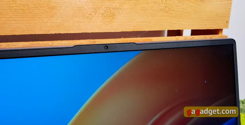 Die Ränder des Bildschirms sind dünn, wobei der Bildschirm 90 % der gesamten Oberfläche einnimmt. Oberhalb des Bildschirms befindet sich eine Webcam mit Aktivitätsanzeige. Sie hat eine FullHD-Auflösung und einen Blickwinkel von 88°. Von den nützlichen Funktionen gibt es Autofokus, wenn sich eine Person im Bild bewegt, sowie Unschärfe und Ersetzen des Hintergrunds.