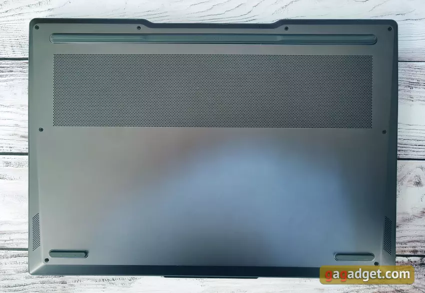 Wir haben bereits das Lenovo Legion Slim 7 der vorherigen Generation getestet. Die Hauptunterschiede lagen in den internen Komponenten des Notebooks. Äußerlich bleibt alles nahezu unverändert: Das Design ist ähnlich. Mit den gleichen Vor- und Nachteilen. Äußerlich sind die Lüftungsschlitze und die Perforation oberhalb des Tastaturblocks nur leicht verändert. Von Design Vorzüge - dünn und ziemlich leicht Ganzmetallgehäuse von dunkelgrauer Farbe, die nicht zu auffällig ist. Die einzigen dekorativen Elemente sind das beleuchtete Legion-Logo auf dem oberen Deckel. Und der von früheren Legion-Laptops bekannte Verschluss der oberen Abdeckung. Es ist nicht an der Kante des Notebooks befestigt, sondern etwas näher am Benutzer.