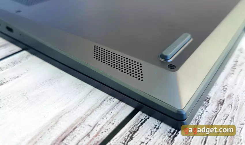 Der Rahmen an der Oberseite und den Seiten des Displays ist dünn, die Webcam mit Anzeige befindet sich an ihrem gewohnten Platz. Es gibt einen mechanischen Verschluss für die Kamera. Mikrofone und das Lenovo-Logo sind unterhalb des Bildschirms angebracht. Der Bereich oberhalb des Tastaturblocks ist mit Perforationen für die Luftzufuhr versehen. Und in der Mitte befindet sich eine runde Einschalttaste mit einer LED am Rande. Es ist auch ein Fingerabdruck-Scanner.