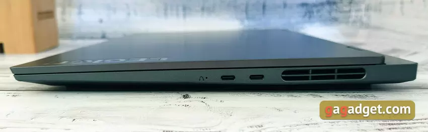 Und nun zu den Nachteilen des Entwurfs. Auf der rechten Seite befinden sich zwei USB Typ-C 3.1 Gen 2 Anschlüsse mit DisplayPort und Power Delivery Unterstützung. Und das sind auch schon alle verfügbaren Anschlüsse für den Anschluss eines externen Monitors in einem, ich erinnere mal, Gaming-Laptop. Und wenn Sie keine Probleme mit dem Anschluss eines externen Monitors haben, müssen Sie wahrscheinlich einen Adapter oder ein entsprechendes, nicht sehr weit verbreitetes Kabel kaufen, um ihn an ein Fernsehgerät anzuschließen. Auf der gleichen Seite befindet sich die Novo-Taste in dem kleinen Loch, mit der Lenovo OneKey Recovery zum schnellen Zurücksetzen des Laptops gestartet wird. Die Belüftungsdüsen haben die gleiche Größe wie beim Vorgängermodell, unterscheiden sich aber dekorativ: Sie sind an den Seiten abgerundet.