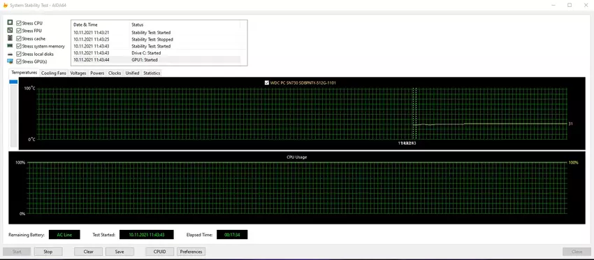 Aus irgendeinem Grund sieht AIDA64 keine Temperatursensoren an allen wichtigen Komponenten des Laptops. Und der Stresstest zeigt nur eine Temperaturkurve für das SSD-Laufwerk. Es bleibt bei 31°. Gleichzeitig sind auch nach 15 Minuten maximaler Belastung keine Anzeichen von Überhitzung oder Unruhe zu beobachten: Das Notebook arbeitet normal weiter, ohne Einfrieren oder ähnliches. Auch beim Spielen anspruchsvoller Spiele über einen längeren Zeitraum hinweg ist kein FPS-Einbruch zu beobachten. Das Kühlsystem ist natürlich hörbar. Aber der Lärm ist nicht zu laut und völlig unauffällig. Die Tastatur bleibt kühl, nur der Bereich darüber wird ein wenig warm.