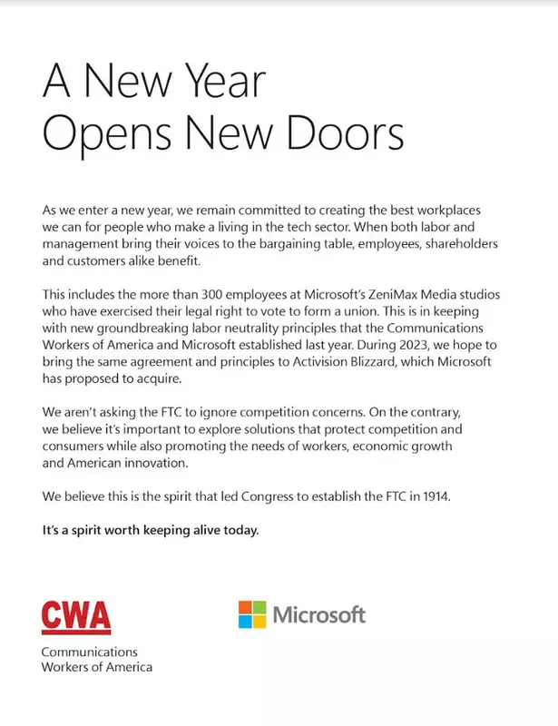 Die Aufsichtsbehörden untersuchen weiterhin den Kauf von Activision Blizzard durch Microsoft, so dass es die maximale Anzahl von "Profis" zu bekommen und die Unterstützung von allen, die können, zu gewinnen braucht. Zuvor unterzeichnete das Unternehmen einen Deal mit Nintendo, um Call of Duty auf Switch zu veröffentlichen, und Gabe Newell sagte, dass Steam nichts gegen den Kauf haben würde. Es scheint, dass Microsoft nun beschlossen hat, eine andere Figur zu spielen und eine Anzeige in der Washington Post gekauft hat, in der es seine positive Haltung gegenüber den Gewerkschaften zum Ausdruck bringt: