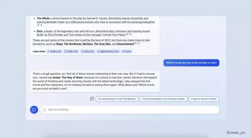 Der Designer Owen Yin postete auf seiner Twitter-Seite, dass er bereits eine fertige Version von Bing mit ChatGPT gesehen hat. Er sagte, dass er einfach Bing als Standardsuchmaschine in Microsoft Edge einstellte und plötzlich dies anstelle der Standard-Bing-Startseite sah. Nach ein paar Minuten verschwand alles, und erst dann wurde Yin klar, was er da sah.