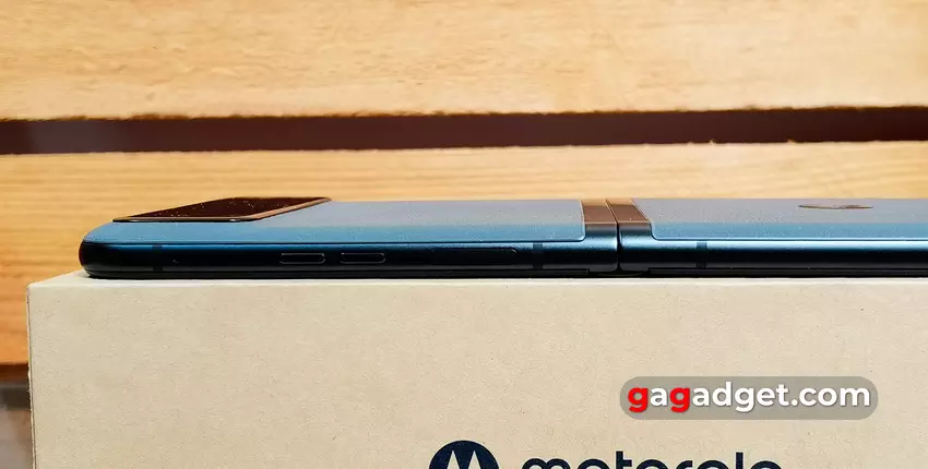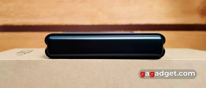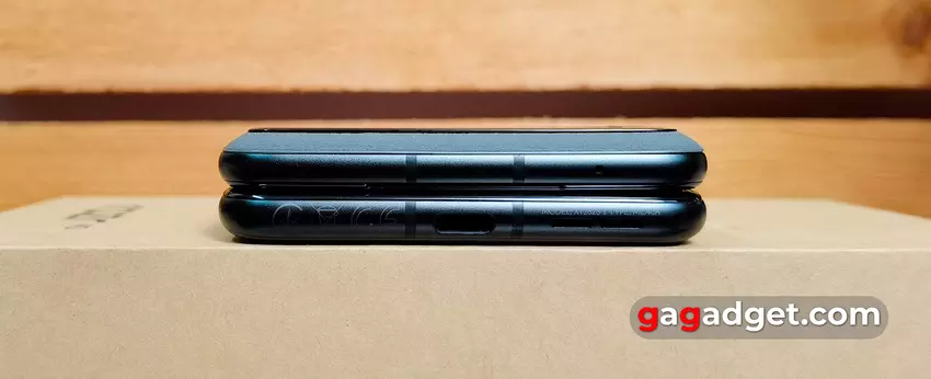 Der Rahmen des Smartphones ist aus Aluminium der Serie 7000 gefertigt und hat eine matte Oberfläche. Im geschlossenen Zustand sind die Hälften fest zusammengedrückt und weisen keine Lücken auf. Die Funktionselemente befinden sich an den gleichen Stellen wie beim älteren Modell. Auf der rechten Seite des Smartphones befindet sich eines der zusätzlichen Mikrofone, separate Lautstärketasten und eine große Einschalttaste, die auch als Fingerabdruckscanner dient. An die Platzierung der Tasten muss man sich, wie bei allen Clamshells, gewöhnen: Sie sind etwas höher platziert als bei herkömmlichen Smartphones.