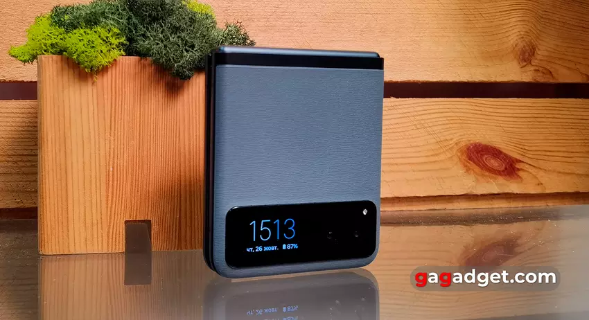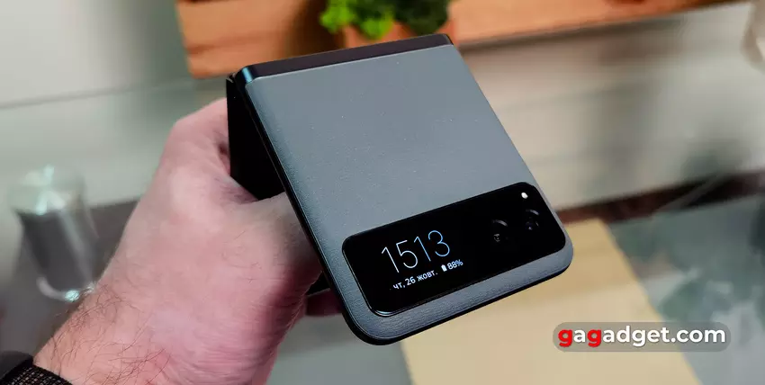 Alle anderen Funktionen eines Smartphones mit diesem Formfaktor sind bereits bekannt. Dies ist die Möglichkeit, Fotos und Videos in einer halbgeklappten Position aufzunehmen, indem man das Smartphone irgendwo hinlegt. Das heißt, es ist kein Stativ erforderlich, und ein Selbstporträt wird mit einer Geste aufgenommen.