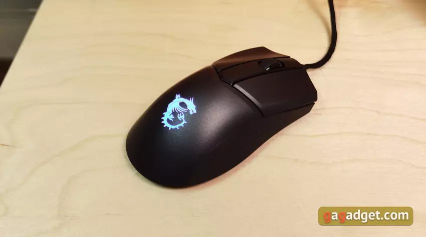 Vor kurzem hatten wir die MSI Clutch GM31 Lightweight Wireless im Test. Wie der Name schon sagt, handelt es sich um ein fast ähnliches Modell, die Unterschiede sind wirklich minimal. Nämlich: das Fehlen einer drahtlosen Verbindung, das Gewicht und ein anderer Sensor. Die Form blieb unverändert, die Maus ist also asymmetrisch und für Rechtshänder geeignet. Es wird der gleiche mattschwarze Kunststoff mit einer rauen Oberfläche verwendet. Auf der "Rückseite" befindet sich ein beleuchtetes Logo der MSI-Gaming-Linie. Die Haupttasten sind vom Gehäuse getrennt.