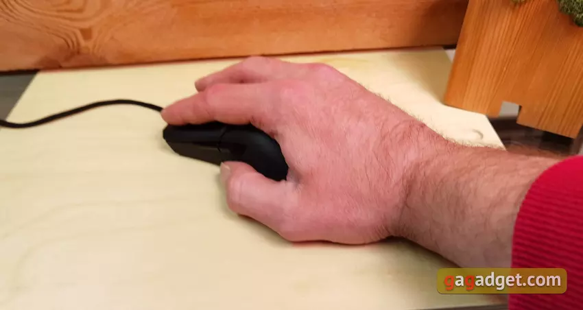 Die Seiten sind mit einer gummiartigen Beschichtung mit einem strukturierten Muster versehen, was dazu beiträgt, die Maus während des Gebrauchs sicherer zu halten. Die zusätzlichen Tasten sind glänzend, haben eine Standardform, aber die Trennung zwischen ihnen ist fast nicht spürbar.