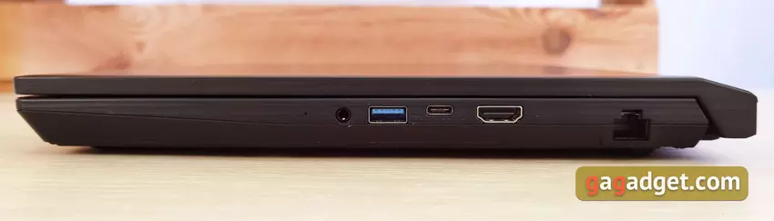 Auf der rechten Seite gibt es keine Belüftungsöffnungen, sodass keine heiße Luft über die Hand mit der Maus bläst. Anschlüsse: 3,5-mm-Combo-Headset-Audio, HDMI (4K/60 Hz), USB 3.2 Gen1 Typ-C, USB 3.2 Gen1 in voller Größe und RJ-45: