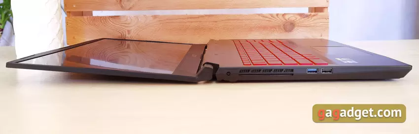 Mit dem MSI Katana GF66 11UD Scharnier können Sie Ihr Notebook mit einer Hand öffnen. Gleichzeitig beträgt der maximale Winkel fast 180 °. Das Display ist gut in den richtigen Positionen fixiert. Die Displayeinheit selbst erweist sich aber als sehr leicht und wackelt ein wenig, wenn man sie mit der Hand einhakt.