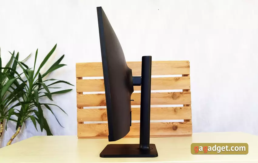 Der Standfuß ist sehr funktionell und ermöglicht eine flexible Einstellung der Position des Monitors. Es ist möglich, die Höhe mit einem Unterschied von bis zu 110 mm einzustellen. In der unteren Position berührt der Monitor praktisch den Standfuß:
