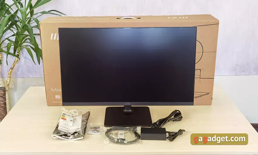 Das MSI Modern MD271P wird in einer großen senffarbenen Schachtel mit dem Modellnamen und allen grundlegenden Informationen geliefert. Das Paket enthält den Monitor selbst, das Netzteil, das Netzkabel, HDMI, VESA-Montageschrauben und die Dokumentation.