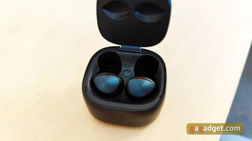 Der Deckel hat eine Autoklappe beim Schließen und hält in diesem Zustand gut. Im Inneren des Cases ist alles fast wie gewohnt: Es gibt Plätze für die Kopfhörer mit Kontakten zum Laden und Magneten zum Einziehen in die richtige Position. Wie die Praxis gezeigt hat, ist das Design nicht das praktischste: Es ist nicht so einfach, die Kopfhörer aus dem Etui zu nehmen. Zwischen den Kopfhörern befindet sich eine Reset-Taste zum Zurücksetzen auf die Werkseinstellungen.