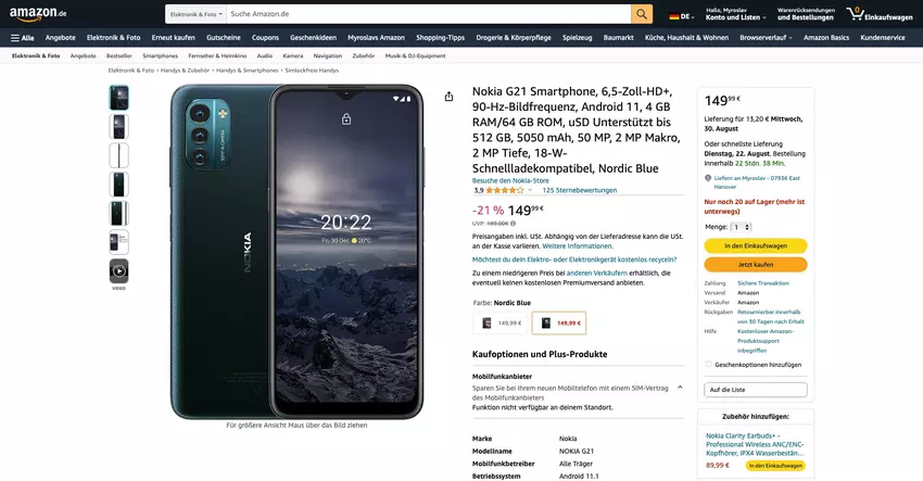 Das Nokia G21 wird von einem 5050-mAh-Akku mit 18 W Ladeleistung angetrieben. Das Gerät ist auf Amazon in zwei Farben erhältlich: Dusk und Nordic Blue.