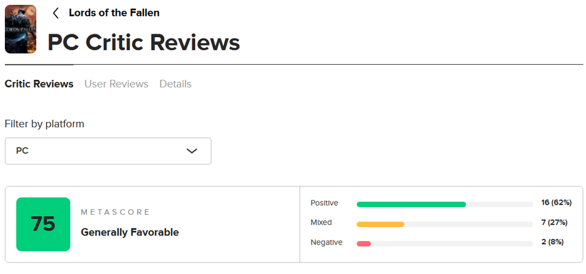 Auf Opencritic erhielt das Spiel 71% von 100%, und 67% der Kritiker empfahlen das Spiel. Sowohl dort als auch auf Metacritic gibt es diejenigen, die von dem Spiel begeistert sind und es als eines der besten seines Genres bezeichnen, aber es gibt auch eine andere Seite, die Lords of the Fallen als eine Kopie von Dark Souls bezeichnet.