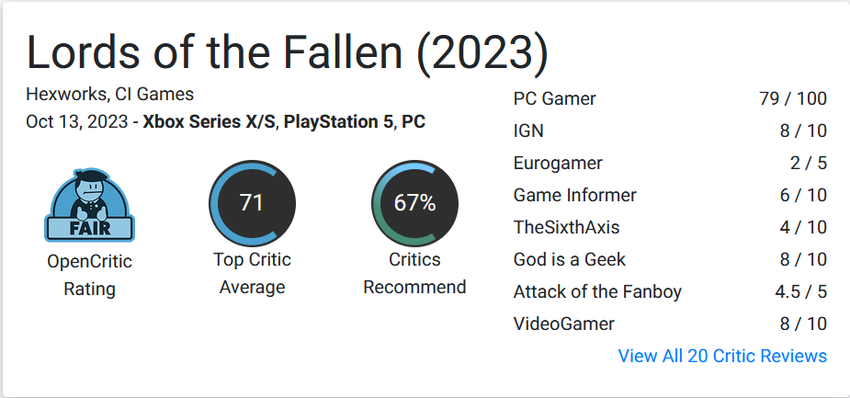 Am 13. Oktober wird das seelenverwandte Lords of the Fallen vollständig veröffentlicht, das eine Neuauflage des gleichnamigen Spiels von 2014 ist. Am Tag vor der Veröffentlichung des Spiels haben die Kritiker ihre Rezensionen veröffentlicht. Die Durchschnittswertung von Lords of the Fallen liegt bei 7 Punkten.