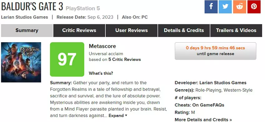 Die PlayStation 5-Version von Baldur's Gate 3 erhielt bei den Aggregatoren die gleichen hohen Wertungen wie die PC-Version.