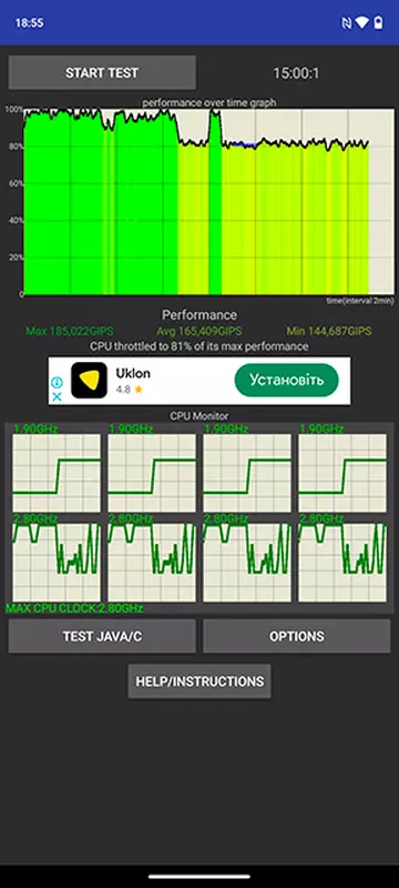 Im Throttling-Test fällt der Prozessor in 15 Minuten maximaler Belastung um bis zu 81% in der Leistung ab. Etwa die ersten 6 Minuten liegt die Leistung nahe am Maximum, dann kommt es zu einem Einbruch. Dabei wird das Gehäuse kaum warm.