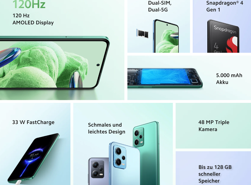 Das europäische Redmi Note 12 5G ist fast identisch mit der chinesischen Version. Die Neuheit ist mit einem Snapdragon 4 Gen 1-Chip, einem 6,67-Zoll-AMOLED-Display mit 120 Hz, einem 5000-mAh-Akku mit 33 W Ladeleistung, NFC, Wi-Fi, Bluetooth und Mini-Jack ausgestattet. Die Auflösung der Hauptkamera beträgt 48 MP + 8 MP + 2 MP, die der Frontkamera 13 MP.
