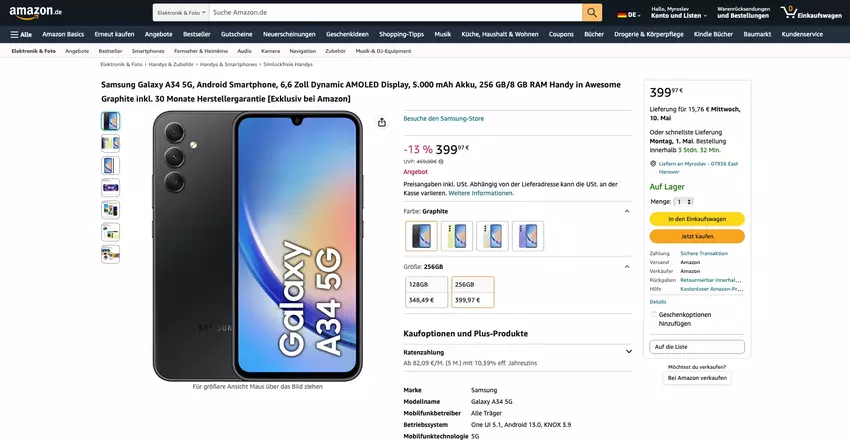 Es handelt sich um das Modell Galaxy A34 5G. Das Smartphone wird auf Amazon in vier Farben und zwei Speichermodifikationen verkauft: