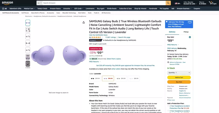 Samsung Galaxy Buds 2 bei Amazon: True Wireless, mit ANC, IPX2 Schutz und bis zu 29 Stunden Akkulaufzeit für $99 ($50 Rabatt)