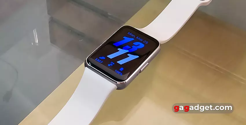 Wenn Sie von oben nach unten streichen, öffnet sich der übliche Vorhang mit Schnelleinstellungen. Und von unten nach oben gibt es ein Menü, das alle Einstellungen (Helligkeit, Always on Display, Gesten zur Aktivierung, Benachrichtigungen, automatische Aktivitätsverfolgung, Herzfrequenzmessung usw.) und zusätzliche Anwendungen (Weltzeit, Taschenrechner, Kalender, Wecker, Timer, Fernsteuerung für die Smartphone-Kamera) enthält.