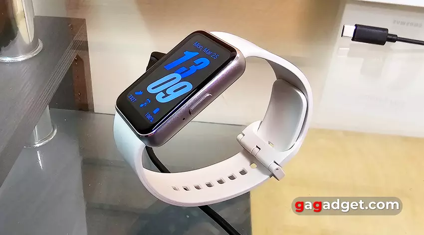 Fast die gesamte Interaktion mit der Samsung Galaxy Fit3 erfolgt hauptsächlich über das 1,6-Zoll-Touchscreen-Display. Das ist nicht viel, aber angesichts der benutzerfreundlichen Oberfläche mit großen Elementen für ein solches Gerät völlig ausreichend. Der Rahmen um das Display ist recht breit. Aber dank der Verwendung einer AMOLED-Matrix scheint es so, als würde es die gesamte Vorderseite des Fitness-Trackers einnehmen.