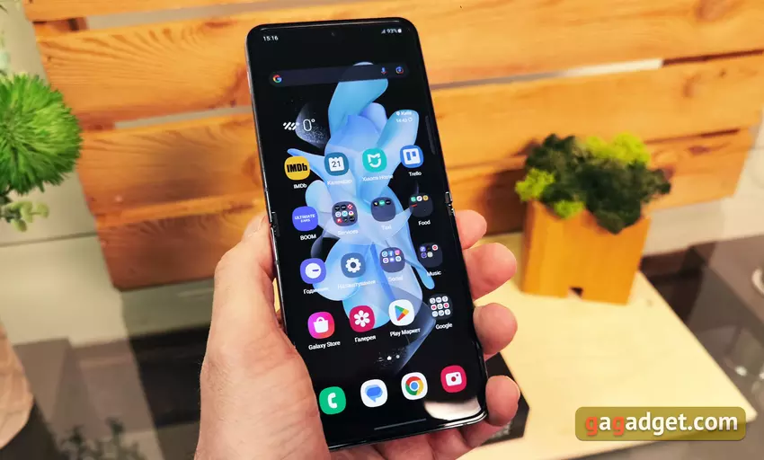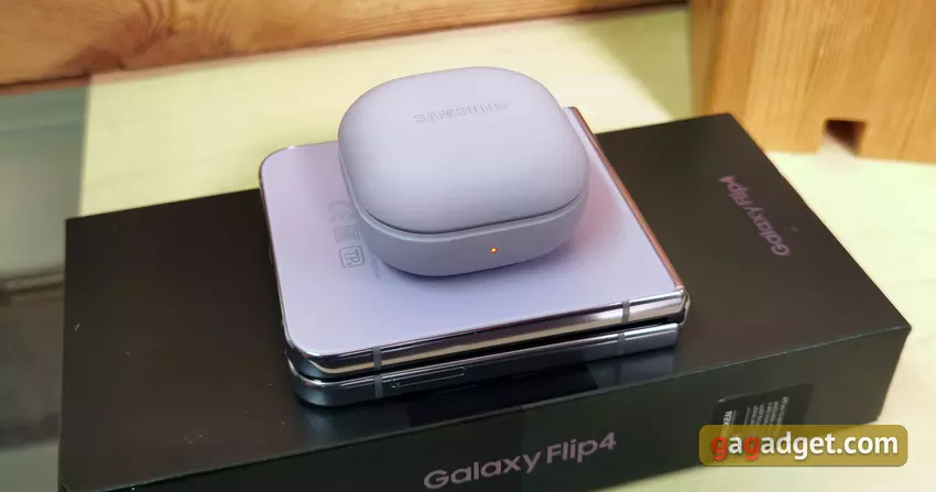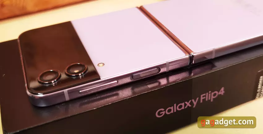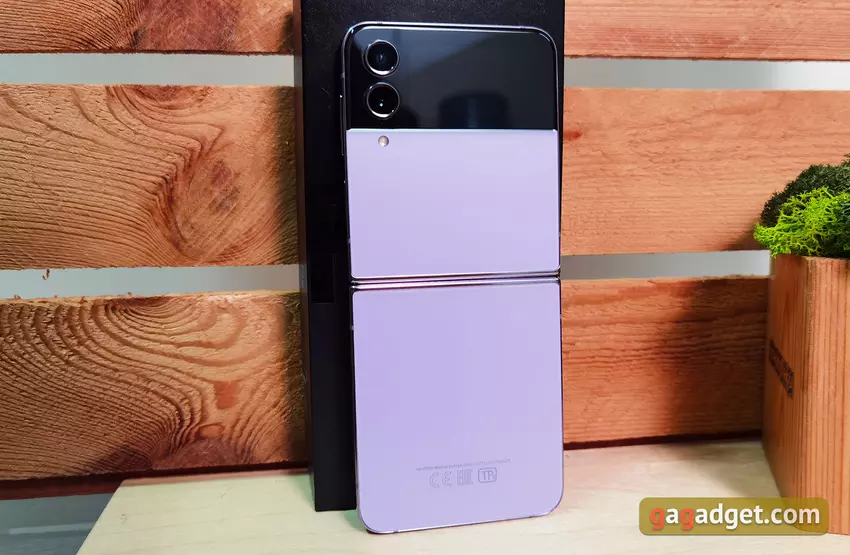 Das Design des Samsung Galaxy Flip4 ist im Wesentlichen unverändert geblieben, mit den bereits bekannten Vor- und Nachteilen. Es handelt sich um ein faltbares Tablet mit einem kleinen äußeren Hilfsbildschirm und einem großen flexiblen inneren Bildschirm. Im zusammengeklappten Zustand ist es ein kleines, aber recht dickes Quadrat, das sich bequem in fast jede Tasche stecken lässt. Alle Paneele sind aus Gorilla Victus+ Glas gefertigt. Sie sind in allen Farboptionen mattiert. Glänzender Metallrahmen, Scharnier und ein kleiner Bereich mit einem externen Display und der Haupt-Dual-Kamera. Der interne Bildschirm hat fast die üblichen länglichen Proportionen. Es ist schwer, das mit Sicherheit zu sagen, ohne das Flip3 zu haben. Aber es scheint so, als ob der Rahmen um den Umfang des Bildschirms und auch der Schutzrand etwas kleiner geworden sind. Ansonsten ist alles beim Alten: Über dem Display befindet sich ein Lautsprecher, im oberen Teil ist ein rundes Loch für die Frontkamera. In der Mitte des Displays befindet sich immer noch eine deutliche Falte. Leider ist es uns noch nicht gelungen, diesen zu beseitigen.