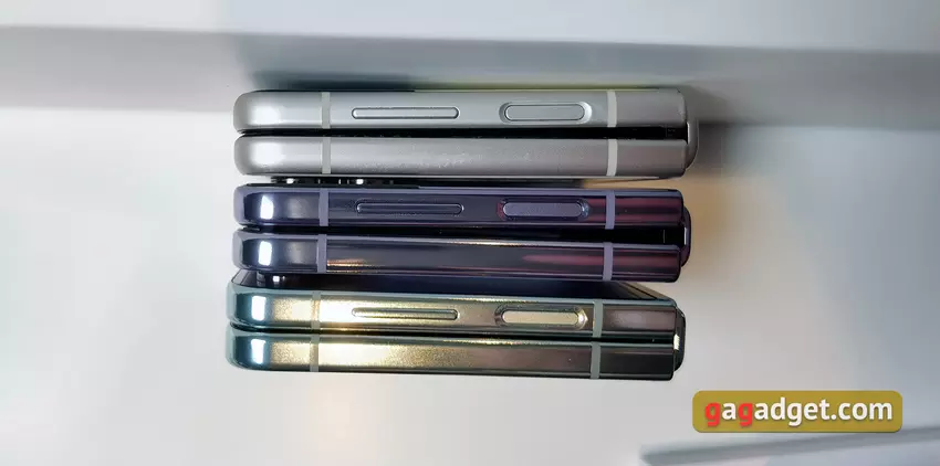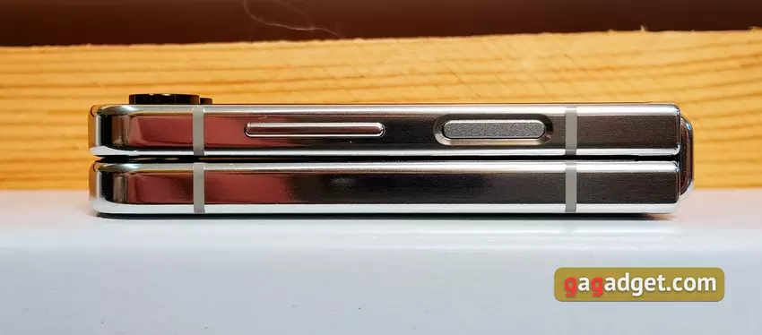 Der Rahmen besteht vollständig aus sogenanntem Armoured Aluminium. Es soll eine erhöhte Widerstandsfähigkeit gegen Stürze und Kratzer aufweisen. Rundherum befinden sich Kunststoffeinsätze für den stabilen Betrieb der Antennen. Das neue Flex-Hinge-Scharnier und die tropfenförmige Faltung des Bildschirms im zusammengeklappten Zustand ermöglichten es, die Lücke zwischen den beiden Hälften des Smartphones zu beseitigen. Dies hat nicht nur ästhetische, sondern auch praktische Vorteile. Es gelangt deutlich weniger Staub und Schmutz ins Innere, was die Wahrscheinlichkeit einer Beschädigung des Displays verringert. Die Lautstärke- und Einschalttasten mit dem Fingerscanner befinden sich an der gleichen Stelle wie zuvor. Sie liegen also etwas höher als bei herkömmlichen Smartphones und sind etwas gewöhnungsbedürftig.