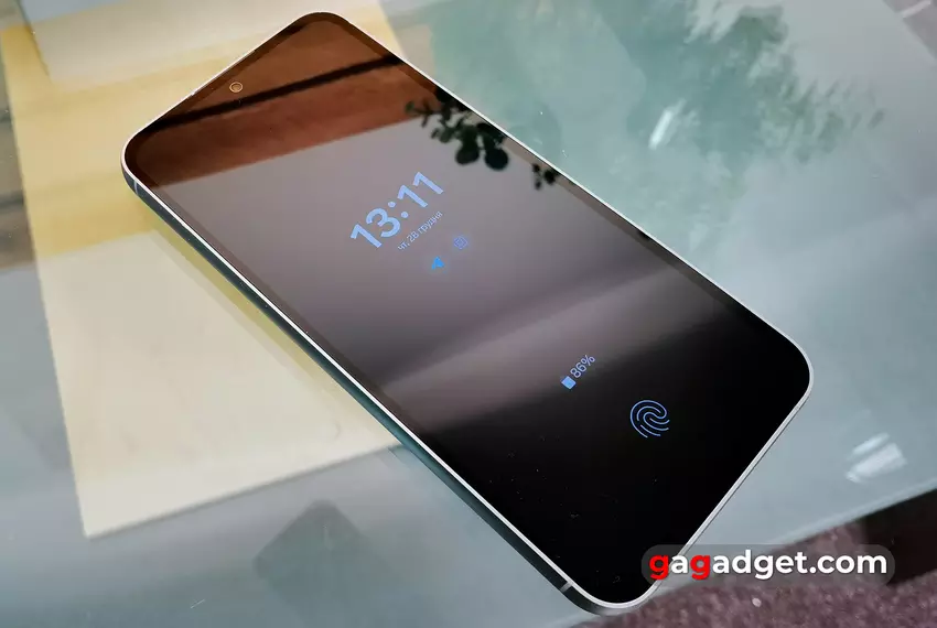 Die Rückseite besteht ebenfalls aus Gorilla Glass 5. Es gibt eine cremefarbene, eine mintfarbene, eine schwarze und eine violette Variante, alle glänzend. Die lila Version sieht am interessantesten aus. Das mintfarbene Modell kam in die Redaktion von Gagadget.com . In natura ist es sehr hell, der mintfarbene Farbton ist kaum wahrnehmbar, es wirkt recht ruhig, man könnte sagen neutral.