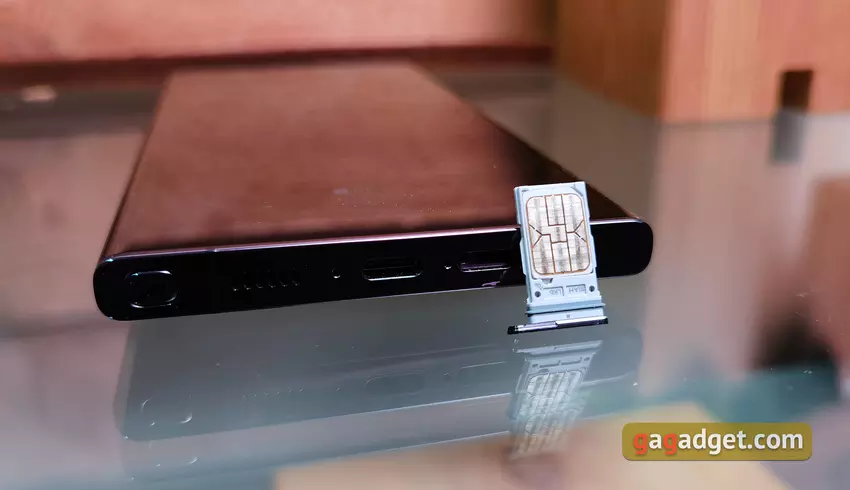 Die Anordnung der Elemente an den Rändern bleibt unverändert. Oben befindet sich ein einzelnes Mikrofon. An der Unterseite befinden sich der externe Hauptlautsprecher , der USB-Typ-C-Anschluss, zwei Mikrofone (die vorherige Generation hatte eines), eine Ablage und ein S Pen. Wie im letzten Jahr befindet er sich auf der linken Seite, sodass er bequem entfernt werden kann, wenn man das Smartphone mit der rechten Hand hält. Wie Sie sehen können, ist die Form des Smartphones rechteckiger geworden. Leider gibt es derzeit keine Möglichkeit, es mit dem Samsung Galaxy S23 Ultra zu vergleichen und zu sagen, welche Form komfortabler ist.
