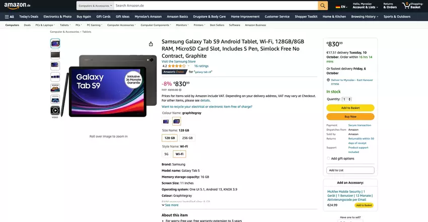 Samsung Galaxy Tab S9 bei Amazon mit einem Rabatt von bis zu 84 Euro erhältlich