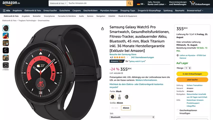 Die Rede ist von der Galaxy Watch 5 Pro. Die Uhr ist jetzt für check price on amazon. Es ist nur eine Farbe erhältlich - Schwarz.