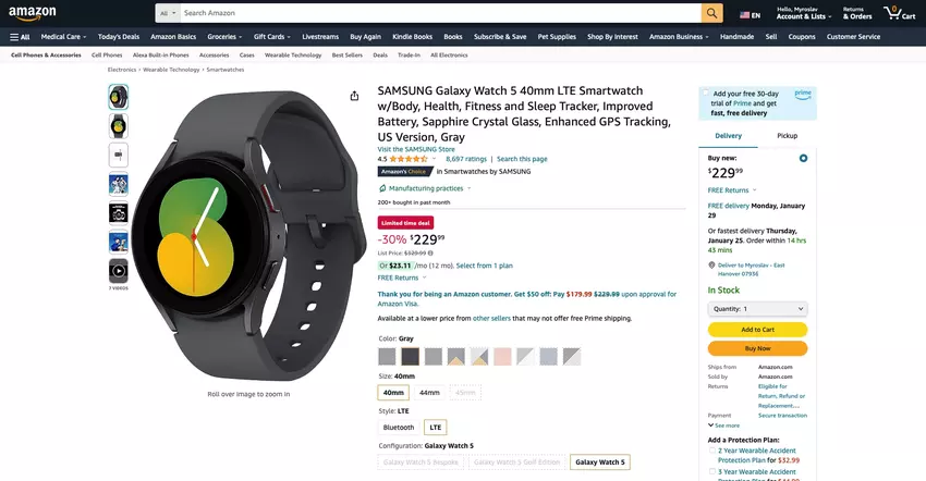 Samsung Galaxy Watch 5 mit LTE ist bei Amazon mit einem Rabatt von $100 erhältlich