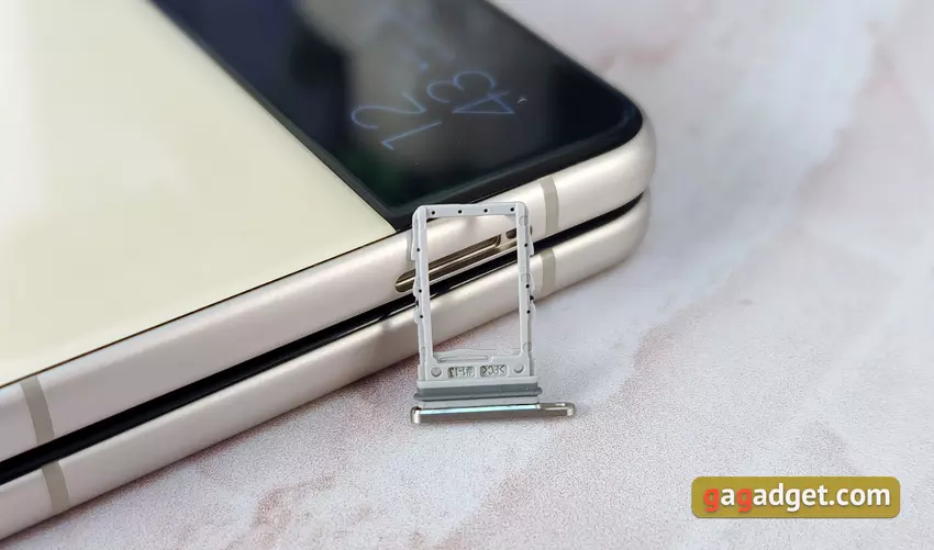 Das Tablett ist, wie beim vergangenen Flip, äußerst bescheiden. Nur eine SIM-Karte, mehr kann nicht installiert werden. Aber Freunde der Verwendung von 2 SIM-Karten müssen sich keine Sorgen machen: Es gibt Unterstützung für eSIM.