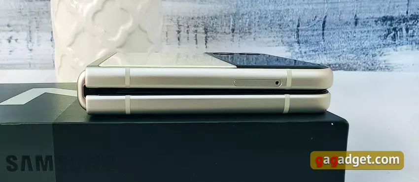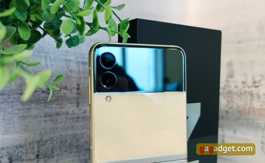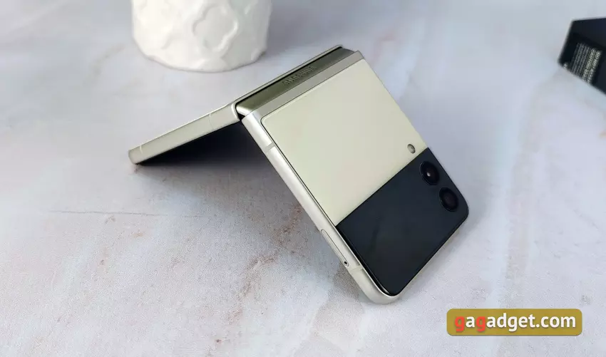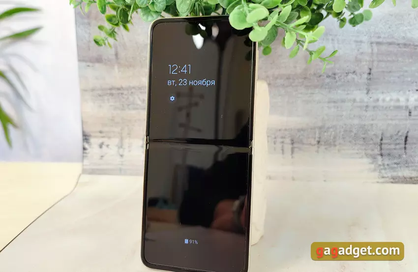 Dank seiner geringen Längsmaße im gefalteten Zustand passt das Samsung Galaxy Z Flip3 perfekt in die Tasche fast jeder Jeans. Dagegen gefällt die erhöhte Dicke etwas weniger. Ein weiteres Feature, das vom ersten Modell übernommen wurde, ist, dass sich das Smartphone nur schwer mit einer Hand öffnen lässt. Das ist ganz real, aber ich habe es nicht geschafft, die entsprechende "Technik" zu entwickeln. Offenbar wirkt sich das Fehlen von Tastentelefonen bei der Verwendung von Clamshells aus. Was bietet dieses Design neben dem Wow-Effekt und der Kompaktheit? Für den Anfang wird in halb gefalteter Form eine Art „Ständer“ zum Aufnehmen sowohl auf der Haupt- als auch auf der Frontkamera erhalten. Ja, und für Videoanrufe nützlich.