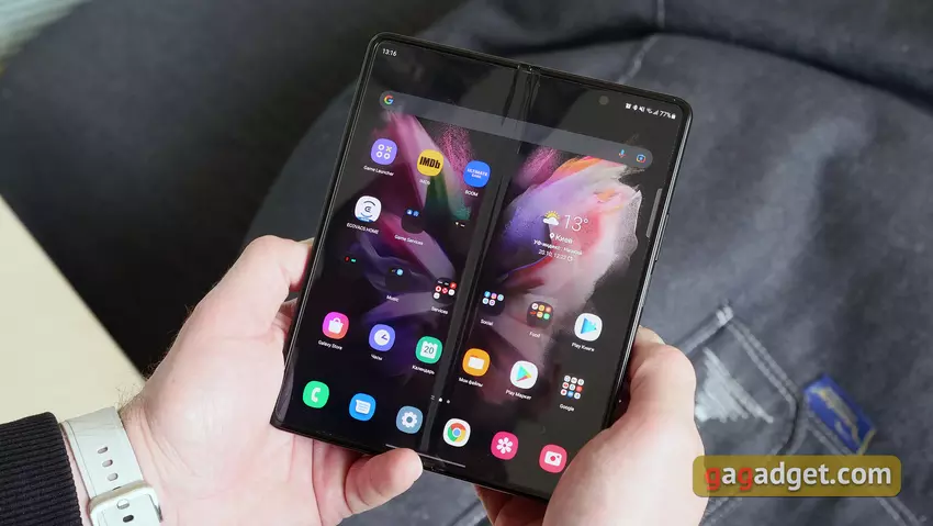 Auf dem Samsung Galaxy Z Fold3 läuft die Android-Version 11 mit der One UI 3.1.1-Oberfläche. Im Grunde ist alles von den bisherigen Samsung-Smartphones bekannt. Mit einigen Ergänzungen, die angesichts des fast tabletähnlichen internen Bildschirms und des Vorhandenseins eines zweiten externen Bildschirms notwendig sind. Es gibt Optionen mit Desktops und separaten App-Menüs, Gesten- und Tastennavigation, Rasteranpassungen, verschiedene Designthemen und so weiter. Von den Funktionen ist es erwähnenswert, dass der interne Bildschirm alle nativen Apps in einer "Tablet"-Version in zwei Spalten anzeigt, was ziemlich praktisch ist. Es ist möglich, für jeden Bildschirm separate Desktops einzurichten oder sie zu duplizieren. Es gibt eine Option, mit der die Arbeit mit einer geöffneten Anwendung fortgesetzt werden kann, wenn zwischen Bildschirmen gewechselt wird. Es funktioniert jedoch nicht mit allen Anwendungen von Drittanbietern. In den Einstellungen gibt es einen separaten Punkt Labs mit "experimentellen" Funktionen. Zum Beispiel erzwungenes Windowing für Anwendungen, die es nicht unterstützen, Anpassung des Seitenverhältnisses usw.
