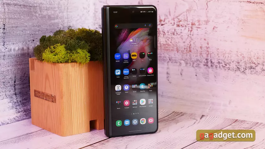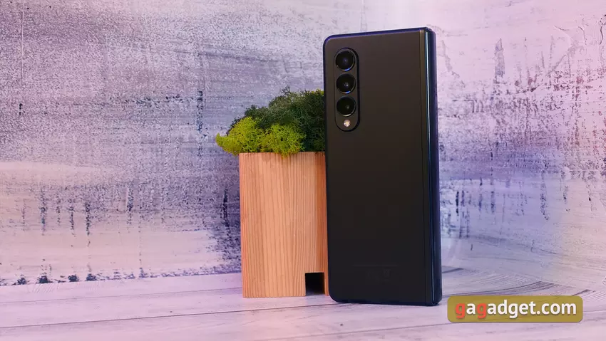 Optisch ähnelt das Samsung Galaxy Z Fold3 seinem Vorgänger, mit Änderungen, die das Smartphone in Einklang mit den aktuellen Flaggschiffen des Unternehmens bringen. Es hat ein schlankeres Design und mattes Glas auf der Rückseite. In geschlossenem Zustand ist das Ergebnis in seinen linearen Abmessungen (insbesondere in der Breite) recht kompakt, ein dickes, griffiges "Sandwich". In dieser Form lässt sich das Smartphone unterwegs sehr bequem mit einer Hand bedienen.