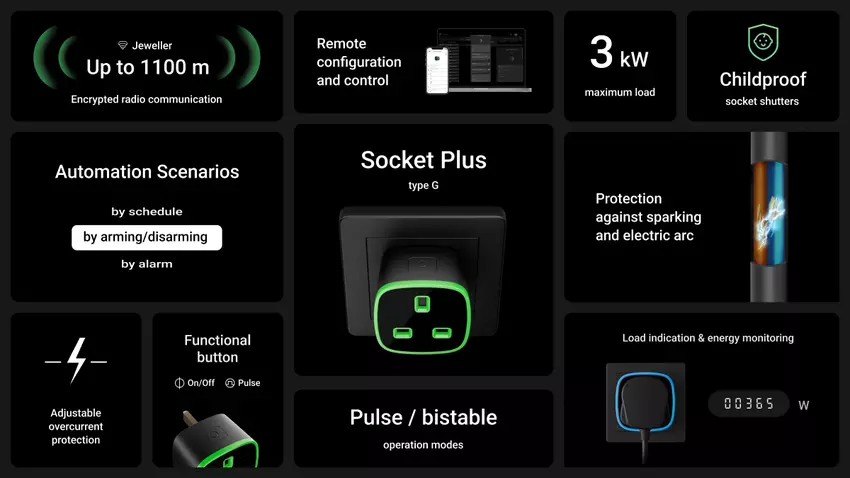 - Socket Plus (Typ G) Steckdose mit Störlichtbogenschutz. Sobald die Melder Funkenbildung am Gerät erkennen, schaltet sich die Steckdose automatisch ab, und eine Benachrichtigung wird an die Ajax-App gesendet.