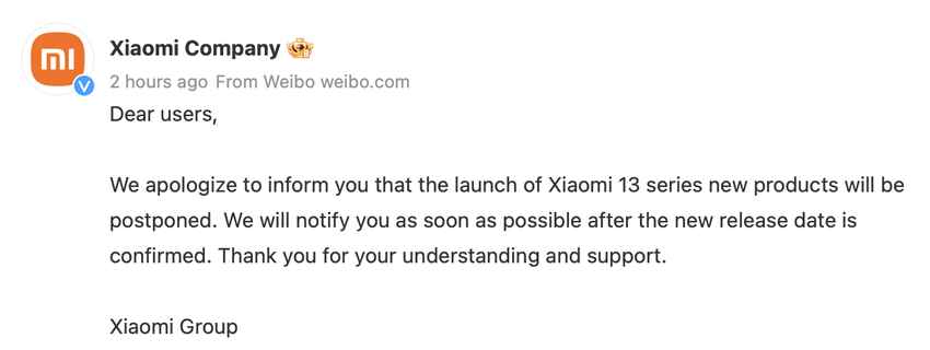Xiaomi hat angekündigt, dass es die Präsentation seiner Flaggschiff-Smartphones Xiaomi 13 und Xiaomi 13 Pro verschiebt.