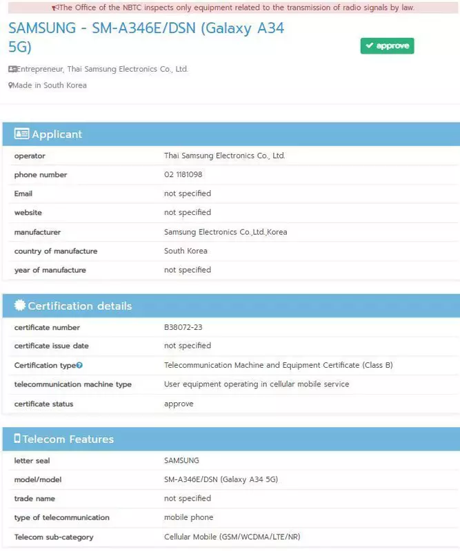 Es handelt sich um das Modell Galaxy A34 5G. Das Smartphone wurde in der Datenbank der Zertifizierungsagentur NBTC gesichtet. Die Veröffentlichung des neuen Produkts ist also nicht mehr weit entfernt. Höchstwahrscheinlich wird das Smartphone auf dem MWC 2023 Ende Februar vorgestellt werden.