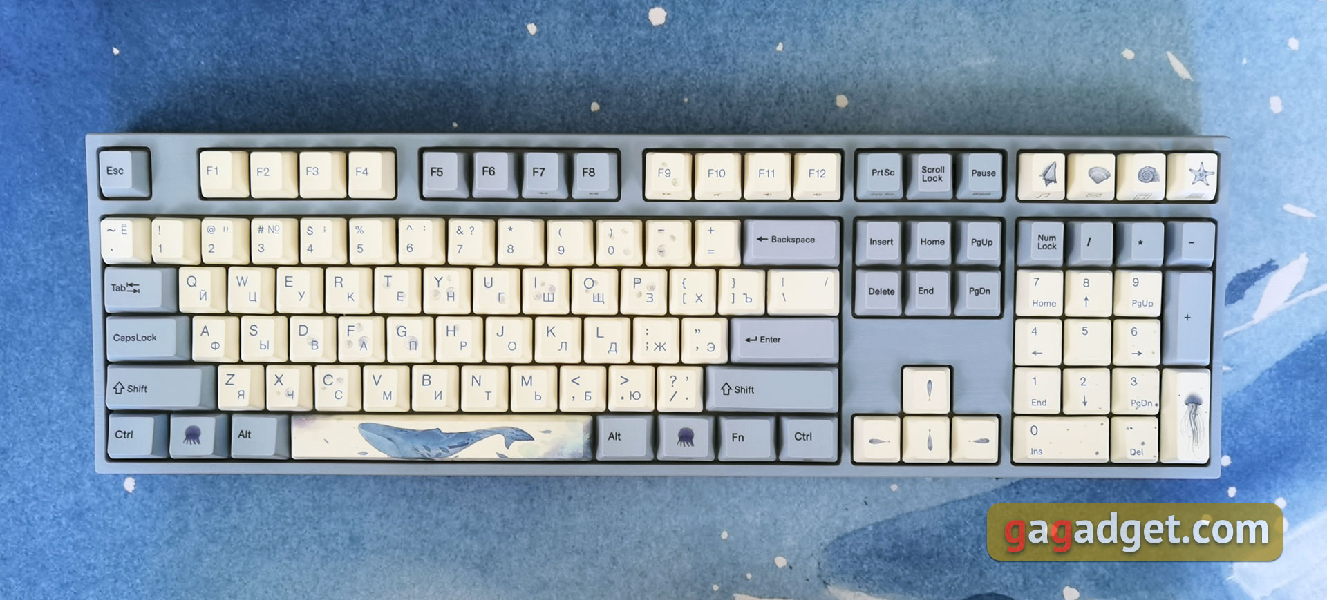 Die Varmilo VA108M Sea Melody ist strukturell eine typische klassische mechanische Tastatur. Im Gegensatz zu den inzwischen beliebten "Skelett-Tastaturen" ist die Tastatur mit einer Kunststoffabdeckung versehen, so dass die mechanischen Schalter für den Benutzer nicht sichtbar sind. Sie werden direkt auf einen Metallsockel montiert. Aber das Design der Tastatur ist sehr ungewöhnlich. Die Tasten sind weiß und blau und einige von ihnen sind mit Motiven aus dem Meer versehen, die von Tropfen über Quallen bis hin zu Muscheln, Seesternen und Walen reichen. Das Design ist ein wenig aufdringlich, aber keineswegs langweilig. Dasselbe Modell ist auch in anderen, "neutraleren" Versionen erhältlich.