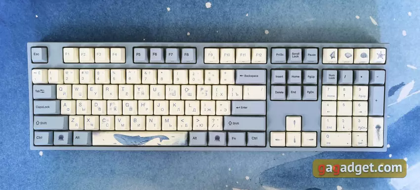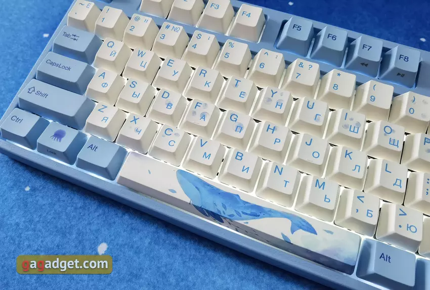 Die Tastatur hat ein Standardlayout. Es ist so, wie es sein sollte: F1 befindet sich über der Taste 2, die Umschalt- und die Rücktaste sind lang, die Eingabetaste ist einseitig belegt. Man braucht sich also nicht daran zu gewöhnen: Alles ist Standard und bequem. Die Tastatur unterstützt N-Key-Roll-Over (NKRO), so dass eine beliebige Anzahl gleichzeitig gedrückter Tasten ausgelöst wird. Alle Symbole und Zeichnungen auf den Tasten werden im Thermosublimationsdruck aufgebracht, sie sind sehr haltbar und färben mit der Zeit nicht ab. Das kyrillische Alphabet ist vorhanden, aber leider gibt es keine ukrainischen Symbole. Dies ist jedoch kein kritisches Problem.